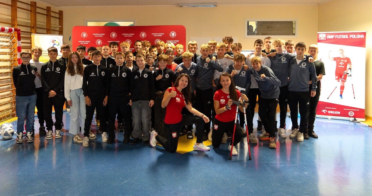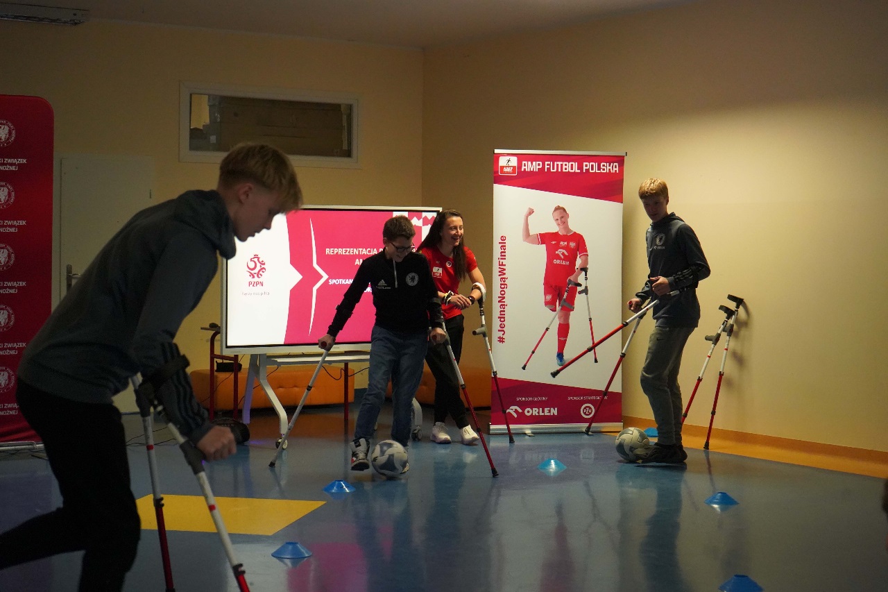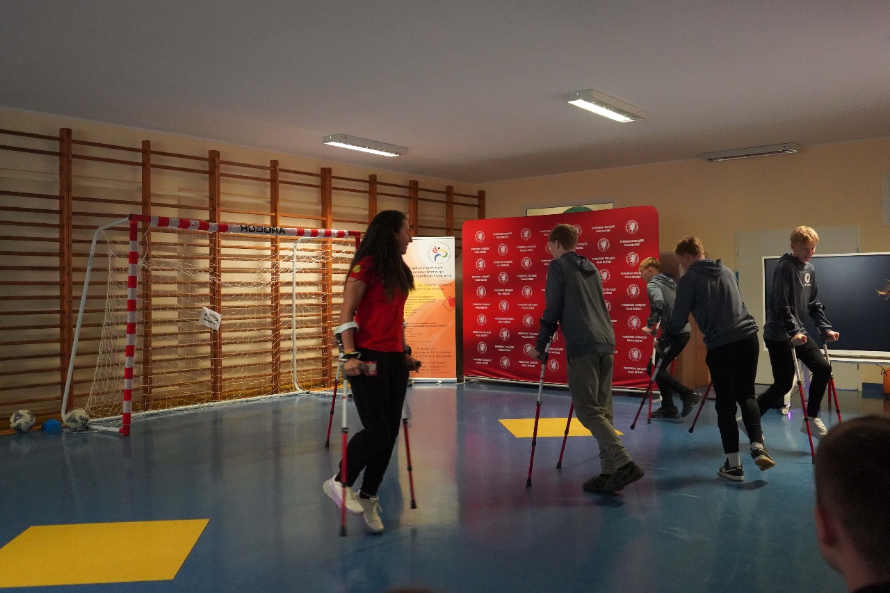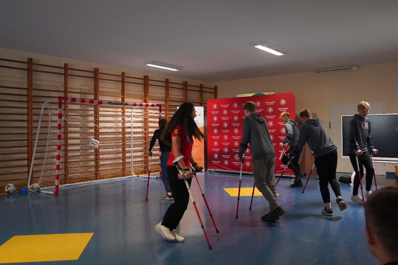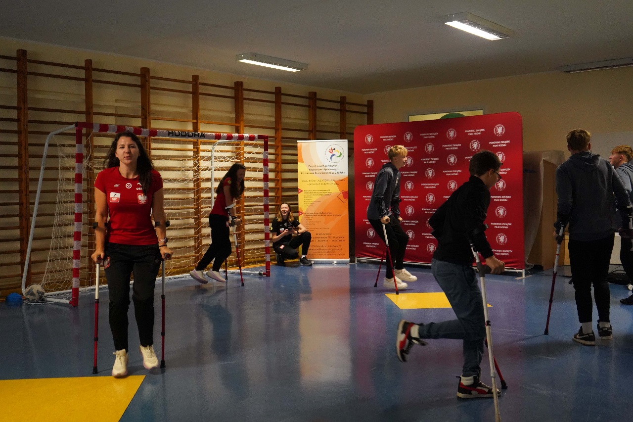 - Sport nie zna barier. Mamy więcej sukcesów niż nóg – mówiła Monika Kukla uczniom klas siódmych i ósmych zgromadzonym w szkole na gdańskiej Żabiance, czym wywołała salwy śmiechu. Było widać i słychać, że biało-czerwonym nie brakuje dystansu do siebie. Po inspirującej prezentacji przyszedł czas na grę. Młodzi piłkarze mogli sprawdzić jak trudno gra się o kulach. Okazało się, że mimo pełnej sprawności i świetnej kondycji naszych uczniów mieli oni problem z koordynacją i obciążeniem. To tylko pokazuje jak wymagający jest to to sport.
