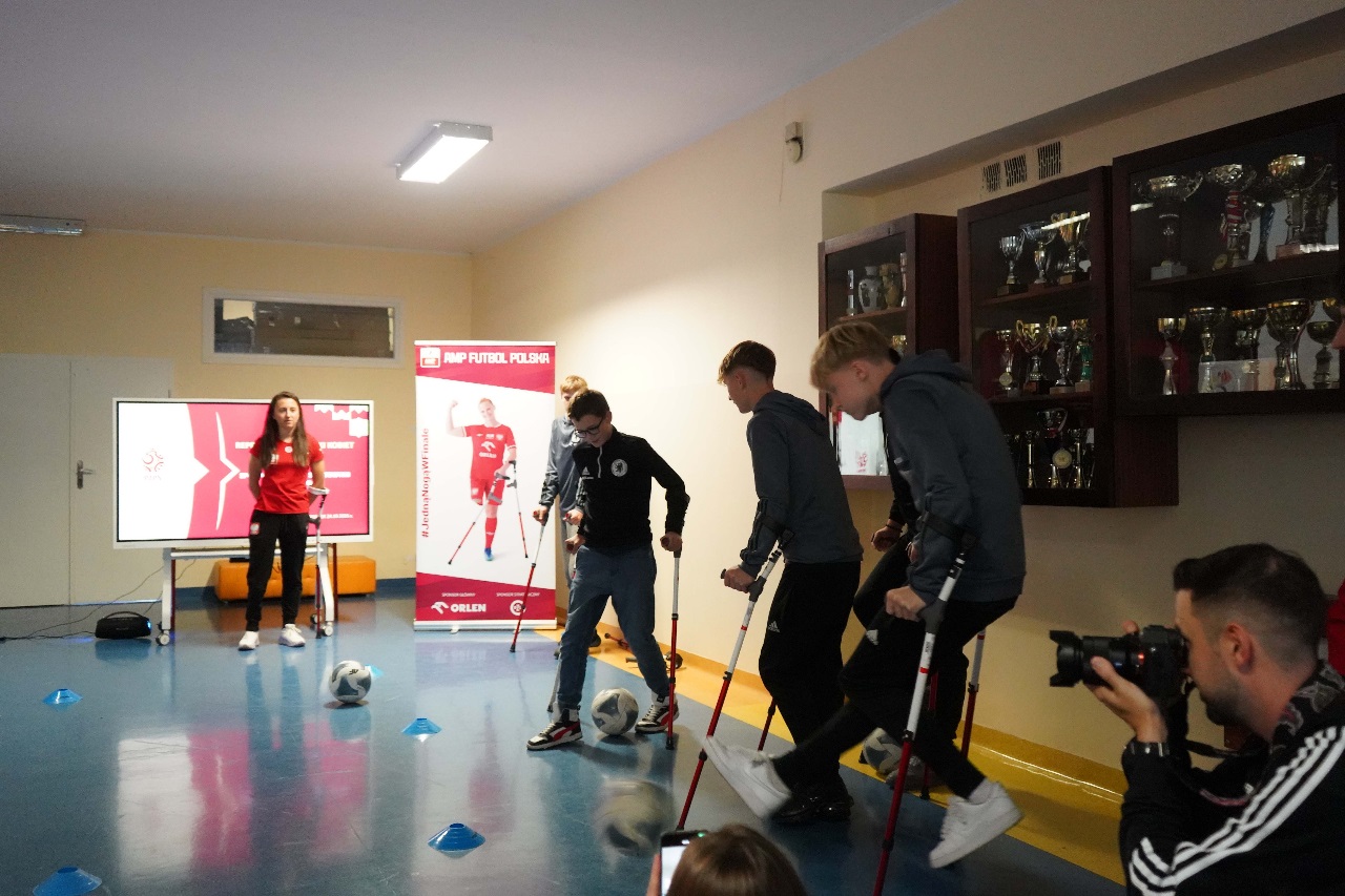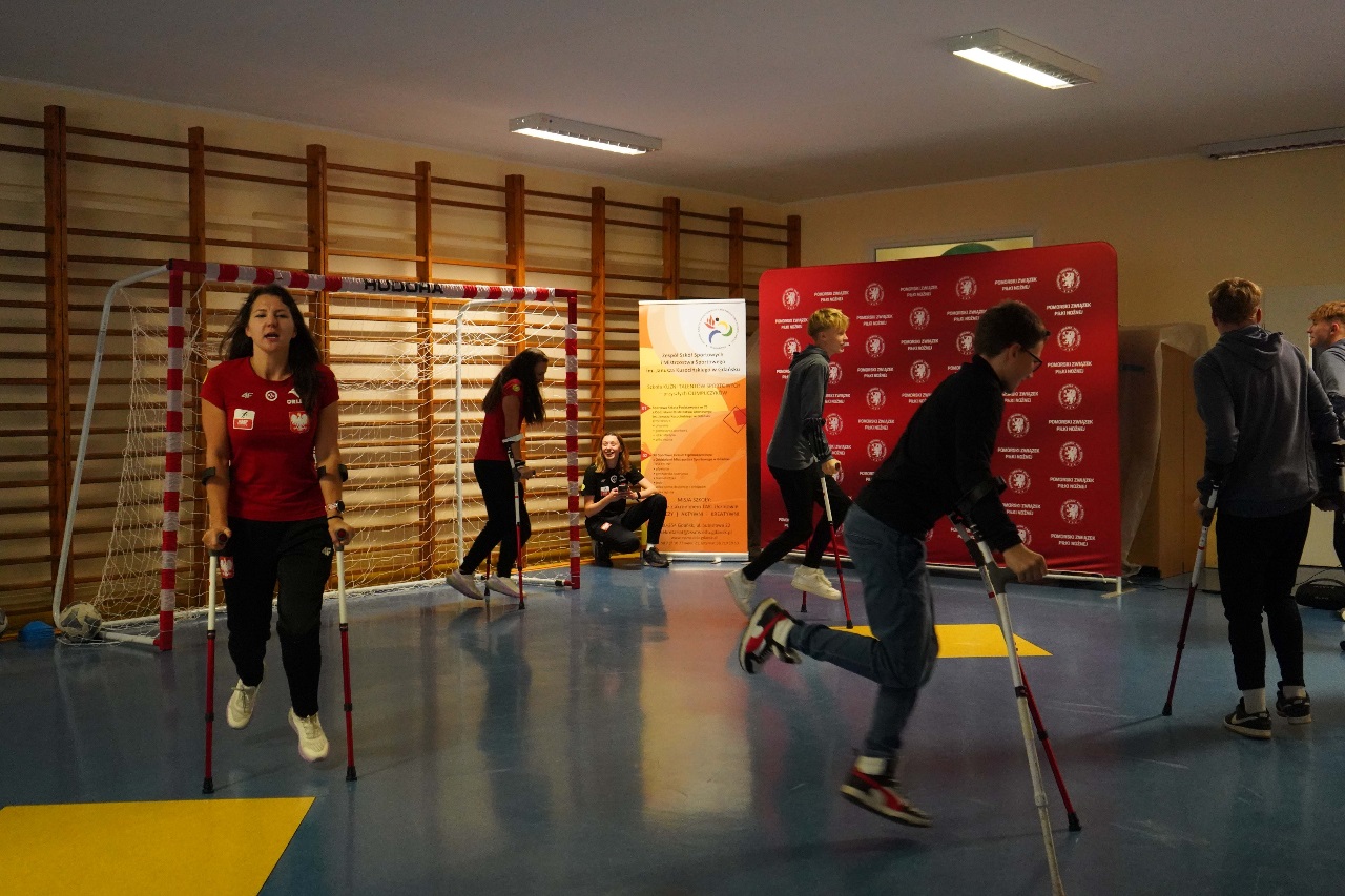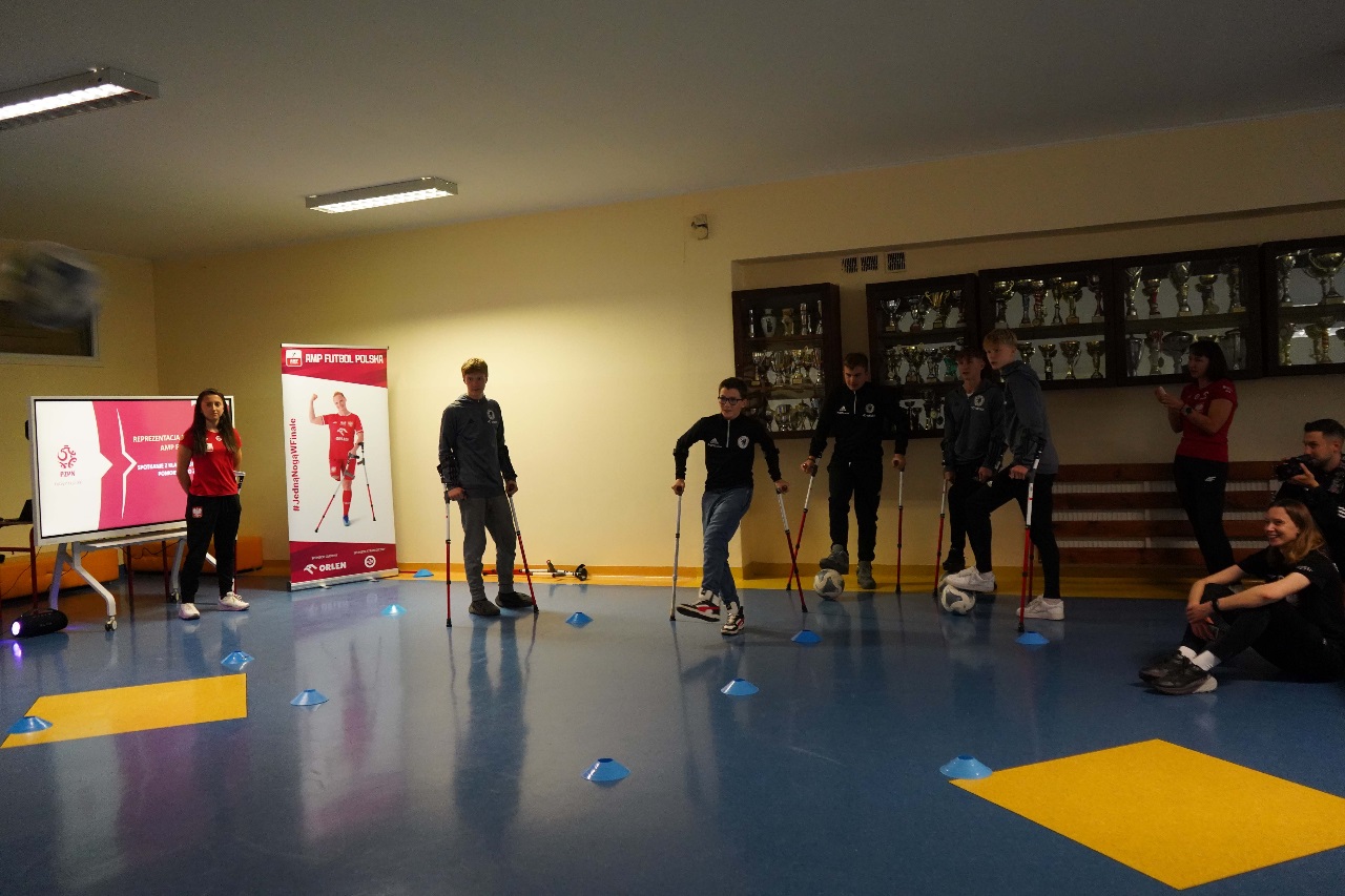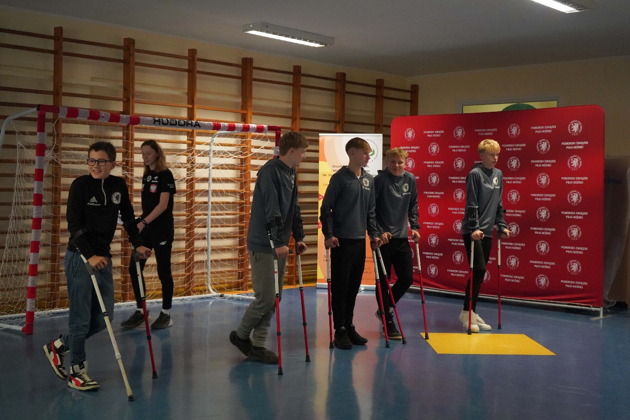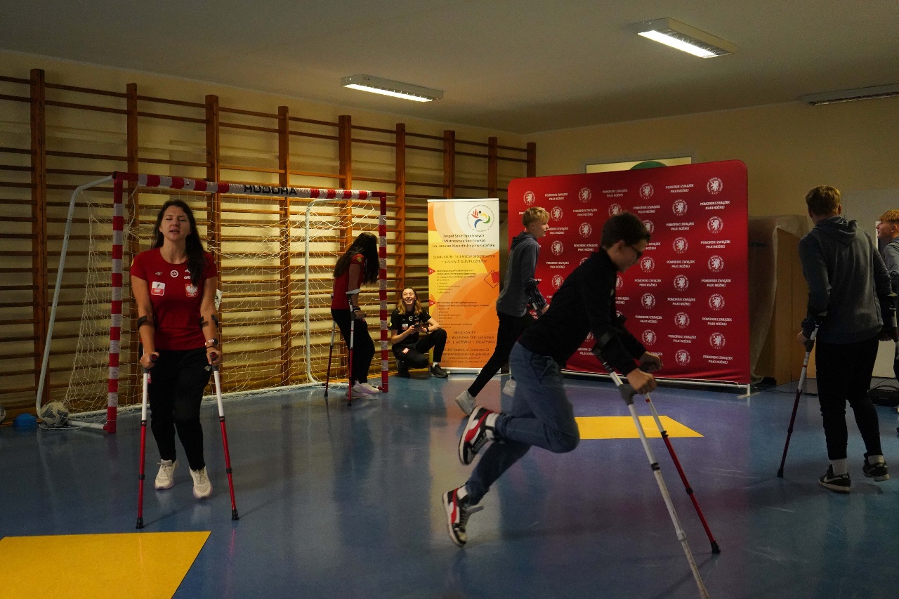 - Sport nie zna barier. Mamy więcej sukcesów niż nóg – mówiła Monika Kukla uczniom klas siódmych i ósmych zgromadzonym w szkole na gdańskiej Żabiance, czym wywołała salwy śmiechu. Było widać i słychać, że biało-czerwonym nie brakuje dystansu do siebie. Po inspirującej prezentacji przyszedł czas na grę. Młodzi piłkarze mogli sprawdzić jak trudno gra się o kulach. Okazało się, że mimo pełnej sprawności i świetnej kondycji naszych uczniów mieli oni problem z koordynacją i obciążeniem. To tylko pokazuje jak wymagający jest to to sport.