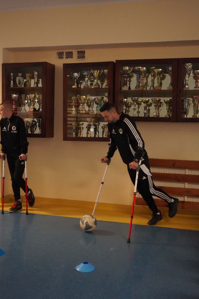 - Bardzo podziwiam nasze reprezentantki, jeden kontakt z piłką dałem radę zrobić, ale następny to już czarna magia – przyznał Oskar Martyś, uczeń VIII klasy, który z uwagą przysłuchiwał się spotkaniu, a potem próbował slalomu i strzałów na bramkę – wszystko to o kulach.