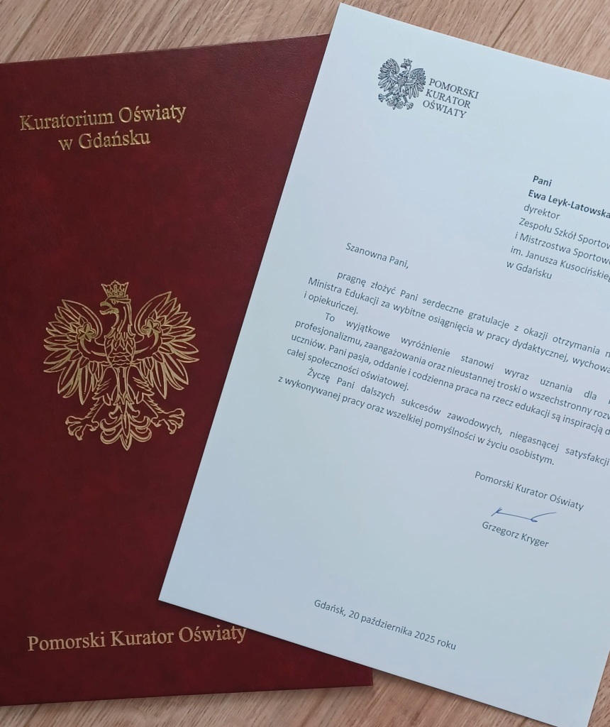 Podczas dzisiejszej uroczystości na ręce Pani Dyrektor został przekazany list gratulacyjny od Pomorskiego Kuratora Oświaty z okazji otrzymania nagrody Ministra Edukacji.