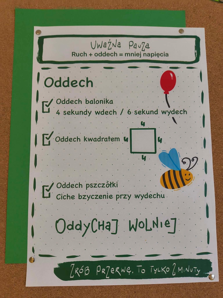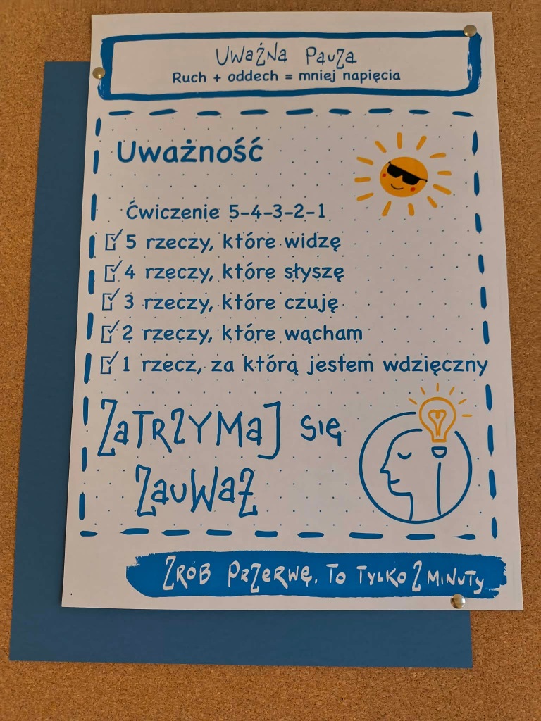 Nauczycielki uczestniczące w mobilnościach przygotowały sketchnotki dotyczące uważności, oddechu i prostych technik redukcji stresu, które mają zachęcać do krótkiej „uważnej pauzy” w ciągu dnia. To wizualne podpowiedzi, jak w zaledwie 2-5 minut zadbać o wyciszenie, oddech i równowagę emocjonalną.