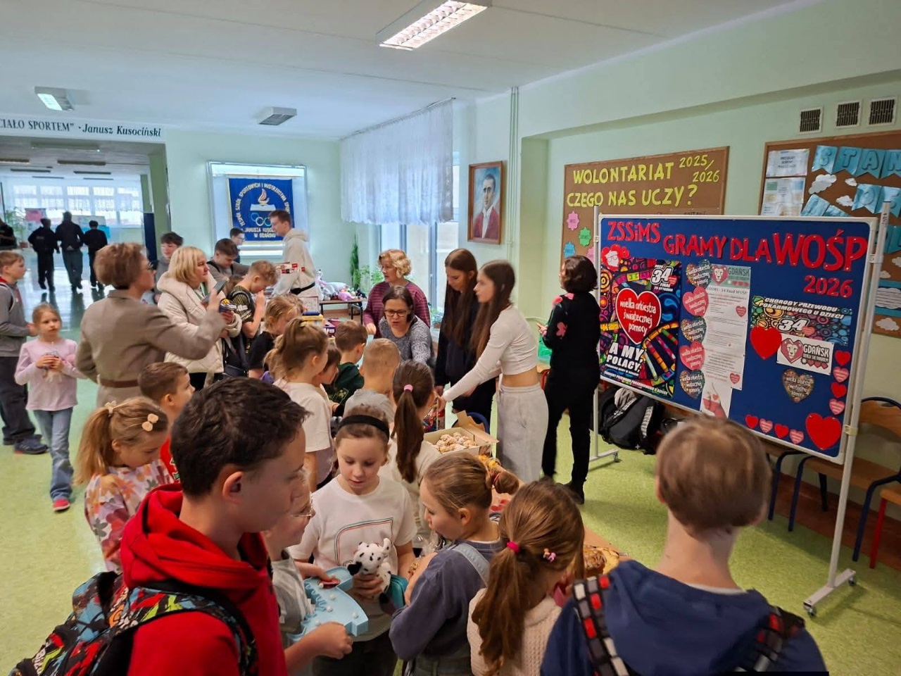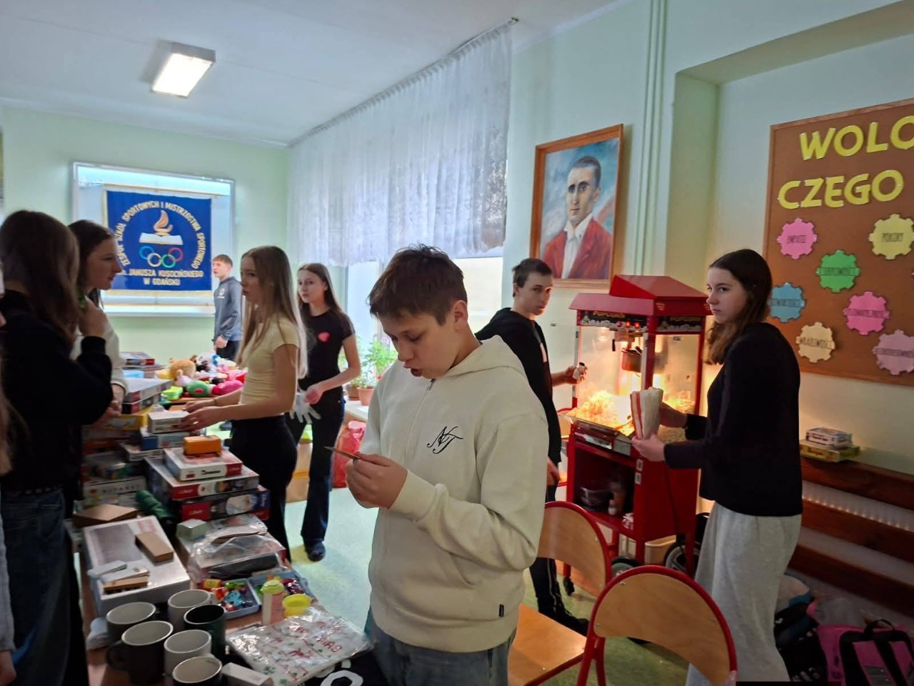 W tym roku po raz kolejny gramy z Wielką Orkiestrą Świątecznej Pomocy i to już od połowy stycznia! W dniach 15 – 16.01.26 dużo się działo!! Była słodka kawiarenka, ogromnym zainteresowaniem cieszył się szkolny bazarek z różnościami. Rekordy popularności biło stoisko z popcornem, który uczniowie robili cieplutki na miejscu. Mieliśmy też kino. Uczniowie klasy 3A wraz z wychowawcą Ewa JI zorganizowali wyjątkowy seans filmowy w swojej sali, która na kilka godzin zmieniła się w prawdziwą salę kinową. Przed wejściem czekali wolontariusze z puszkami WOŚP i charakterystycznymi serduszkami, które pełniły rolę biletu wstępu. Pieniądze za ich „zakup” zasiliły oczywiście konto Orkiestry.
